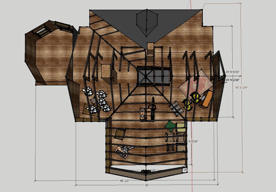 The Attic set was very important as it had to play not only for the nexus between realities, but we had a 4 person cast who had to be seen and at the same time be hidden when scripted. Also the mirror had to be clearly fixed but not in the center of the room and the observation device had to have its own small wing .. so fairly high ceilings and raised side walls…