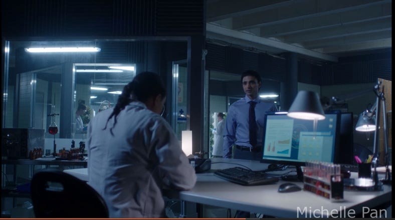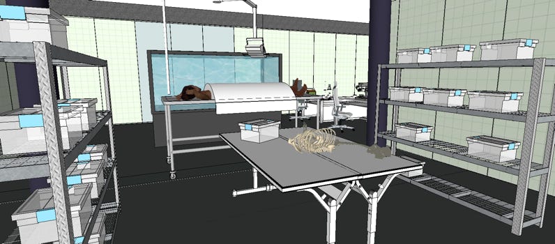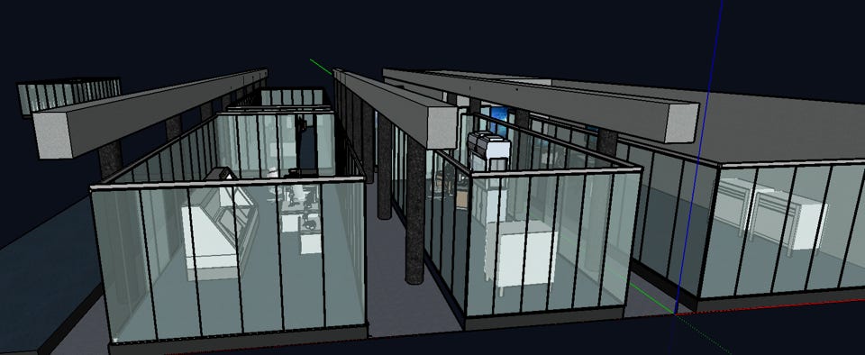 We decided to incorporate a Naval Research Facility into our Siren world. The old Andre’s Wine facility in Port Moody allowed us to have a very stark, glass and wall lab structure, with long hallways and low lighting. We were stuck with the concrete pads that were built for wine making, but Baron Shaver Construction and I came up with a fairly cool working environment .. It needed to be open to view, but isolated in feeling also …